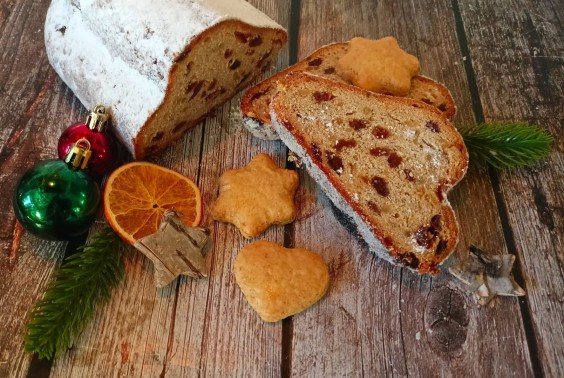 DINKELMEHL 630, Rosinen, BUTTERFETT (laktosefrei), Zucker, , MANDEL (gestiftelt, geröstet), MILCH 3,5%, Zitronat, Orangat, Hefe, MARZIPAN, frische EIER, Amaretto, Rum 80%, Honig, Salz, Zimt, CARDAMOM, Koriander, Fenchel, Anis, Muskat,Gewürznelken.