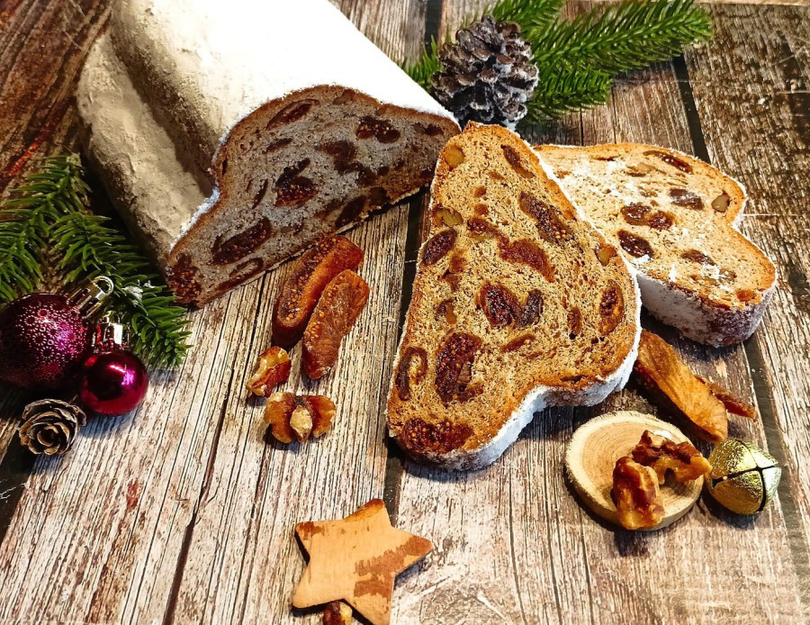 DINKELMEHL 630, Feigen getrocknet, BUTTERFETT, VOLLMILCH, WALNÜSSE, Kristallzucker, Likör 43, Hefe, MARZIPAN, Honig, frische EIER, Salz, Zimt, CARDAMOM, Koriander, Fenchel, Kümmel, Anis, Muskat, Gewürznelken.