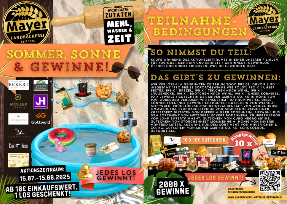Zu gewinnen gibt es insgesamt 2000 Preise, jedes Los gewinnt. Davon sind insgesamt 1990 Preise Sofortgewinne wie folgt: 990 x 1 Unser Bestes, 198 x 1 Brezel, 198 x 1 Teilchen nach Wahl, 198 x 1 Laugenecke, 198 x 1 Brötchen nach Wahl, 198 x 1 Unser Körniges, 10 x jeweils 1 Gutschein der Mayer GmbH & Co. KG in Höhe von 10€. Außerdem verlosen wir insgesamt 10 Hauptpreise, diese können folgende Gewinne enthalten: Gutschein von Weingut Gottwald, Frühstücksgutschein/Traubensaft von Weinzuhause Mommenheim, Fruchtaufstriche von Gemüsehof Reinheimer, Kaffeespezialitäten von Kaffee Müller Bodenheim, Auswahl aus dem Sortiment von Metzgerei Eckert Bodenheim, Zauberzubehör von JoHa Entertainment, Gutschein von Cubo Negro Mainz, Gutschein von Storchennest Mommenheim, Honig von Imkerei Manfred Maser, Auswahl aus dem Sortiment von Mayer GmbH & Co. KG, Gutschein von Mayer GmbH & Co. KG, Schokolade, Dekoartikel.